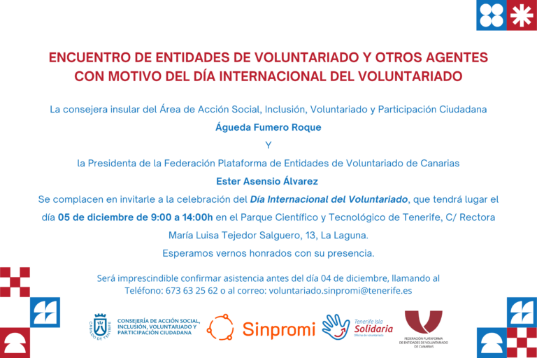 Desde el Programa Tenerife Isla Solidaria – Sinpromi y la Federación Plataforma de Entidades de Voluntariado de Canarias, queremos hacerles una invitación muy especial para celebrar y conmemorar el Día Internacional del Voluntariado, participando en un encuentro que reunirá a diversas entidades de la isla con el propósito de compartir y visibilizar el inmenso valor de su labor. Este encuentro nace desde un profundo agradecimiento por el trabajo incansable que realizan las entidades de voluntariado y las personas voluntarias en beneficio de la isla de Tenerife.