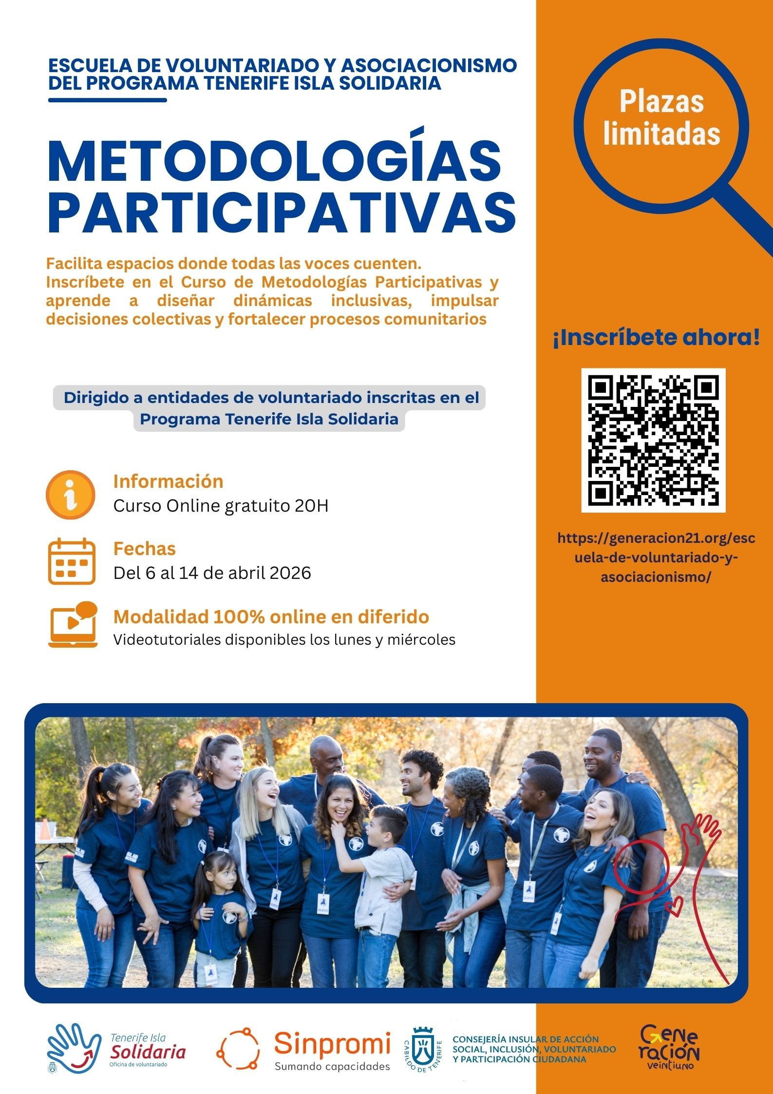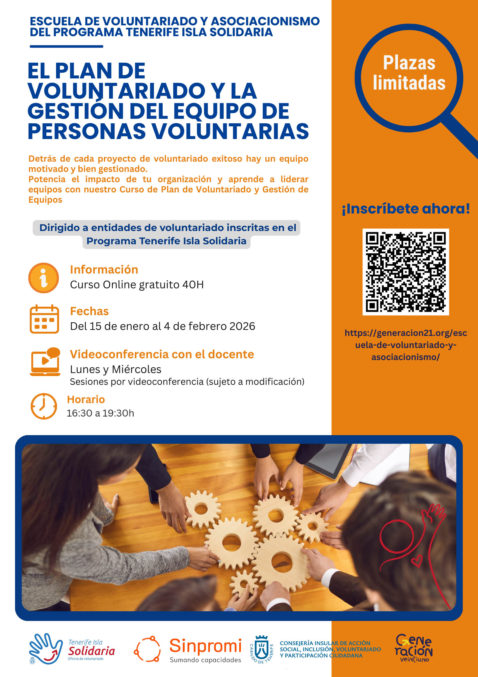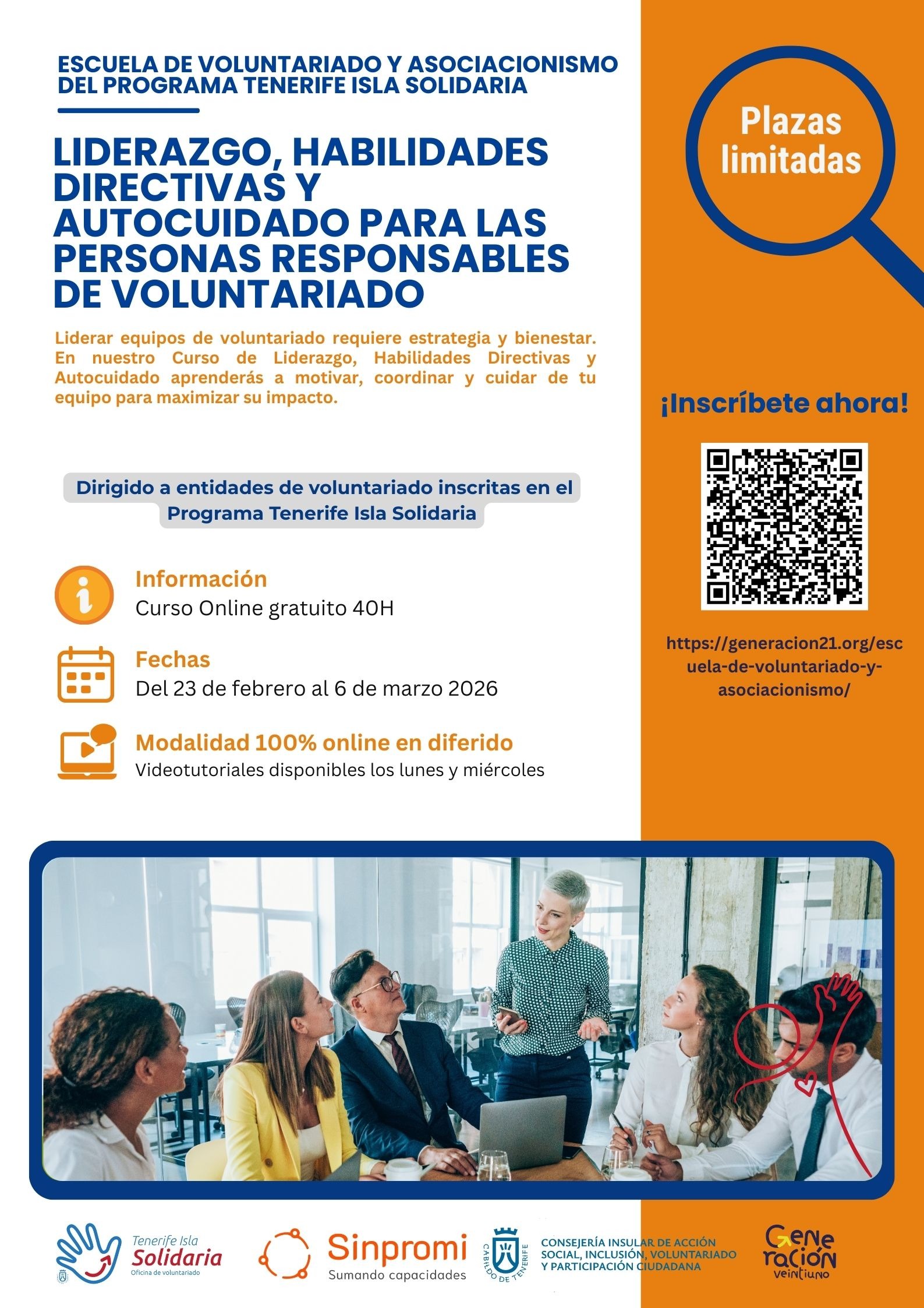 Fecha: Del 26 de enero al 1 de marzo Hora: Libre a elección del alumnado dentro de la duración del mismo Modalidad: Online. PLAZO DE INSCRIPCIÓN HASTA EL 18 DE ENERO Requisitos de acceso: Responsables de voluntariado y personal profesional de Entidades de Voluntariado. Certificación/Diploma: Sello Certifica+ (formación en competencias transversales del voluntariado). |