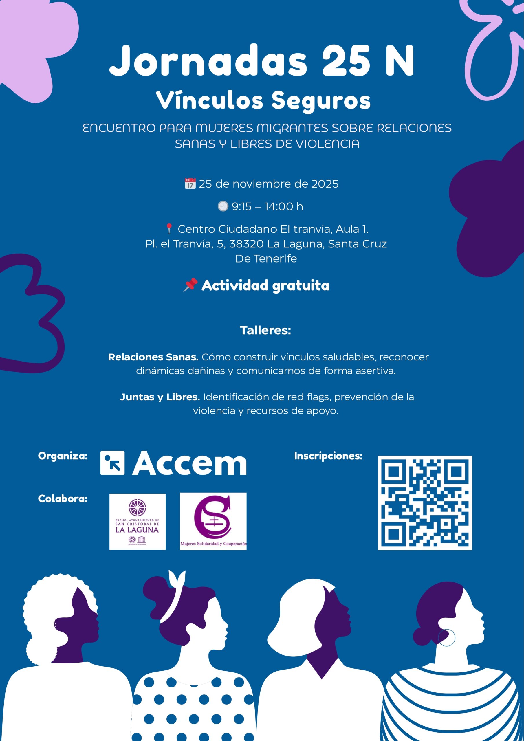 Desde Accem, junto con la Asociación Mujeres, Solidaridad y Cooperación, estamos organizando las jornadas Vínculos Seguros – 25N,un espacio dirigido a mujeres migrantes para reflexionar, aprender y compartir herramientas sobre relaciones sanas y prevención de la violencia de género.