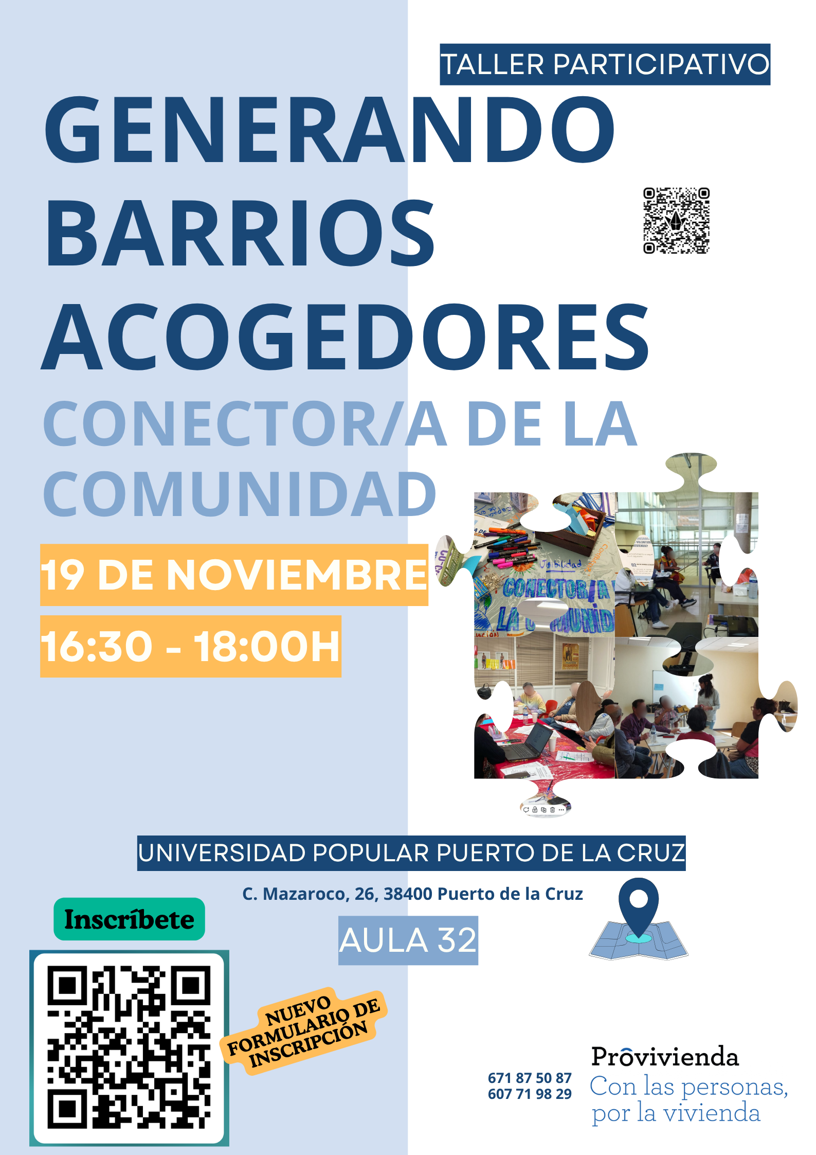 Desde Provivienda, les invitamos a formar parte del siguiente taller participativo GENERANDO BARRIOS ACOGEDORES: CONECTOR/A DE LA COMUNIDAD. Destinado tanto a personas técnicas como beneficiarios/as de proyectos.