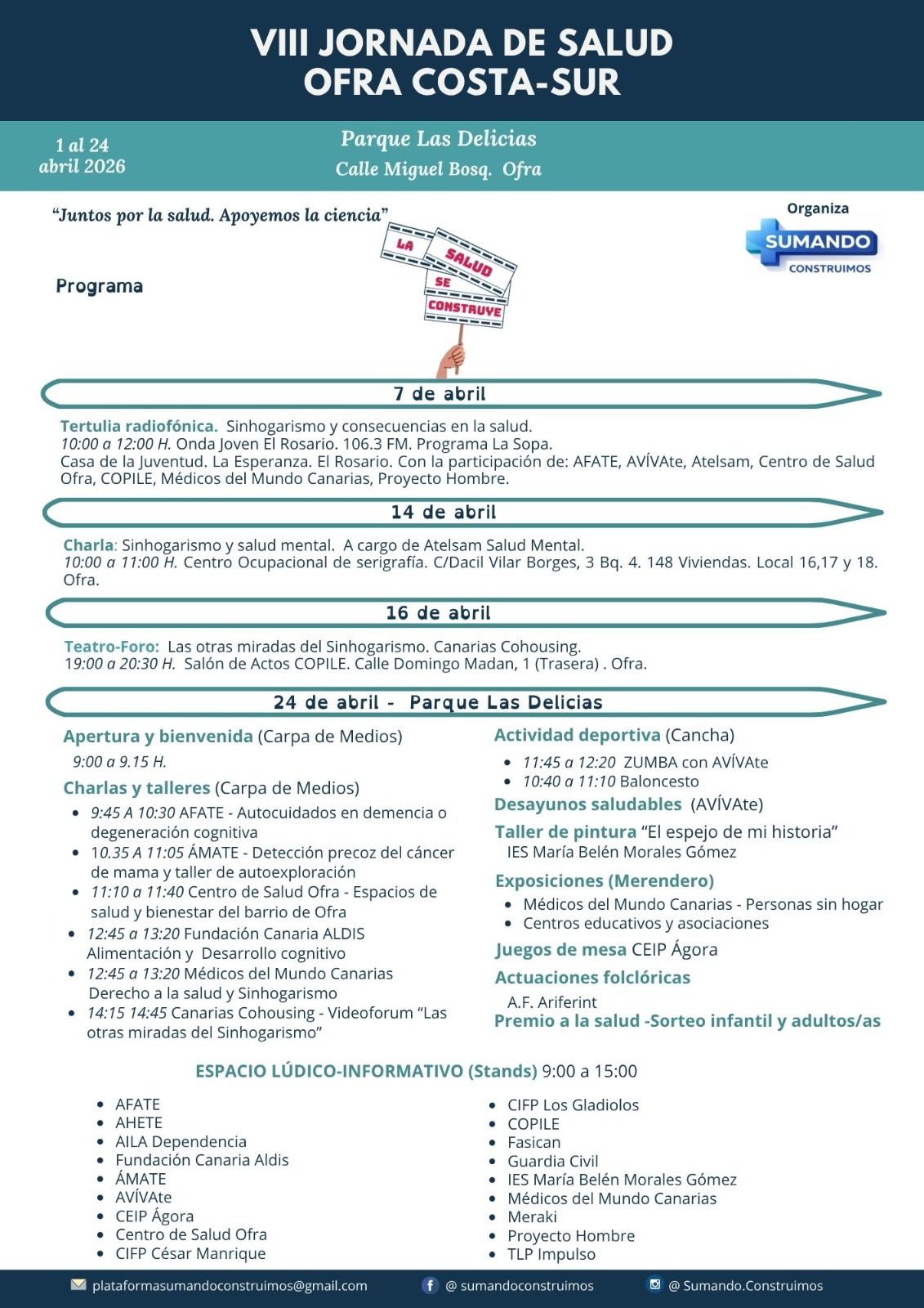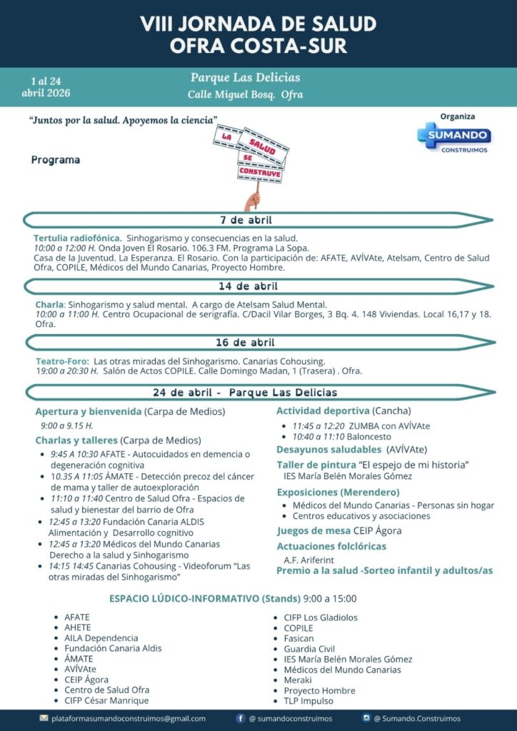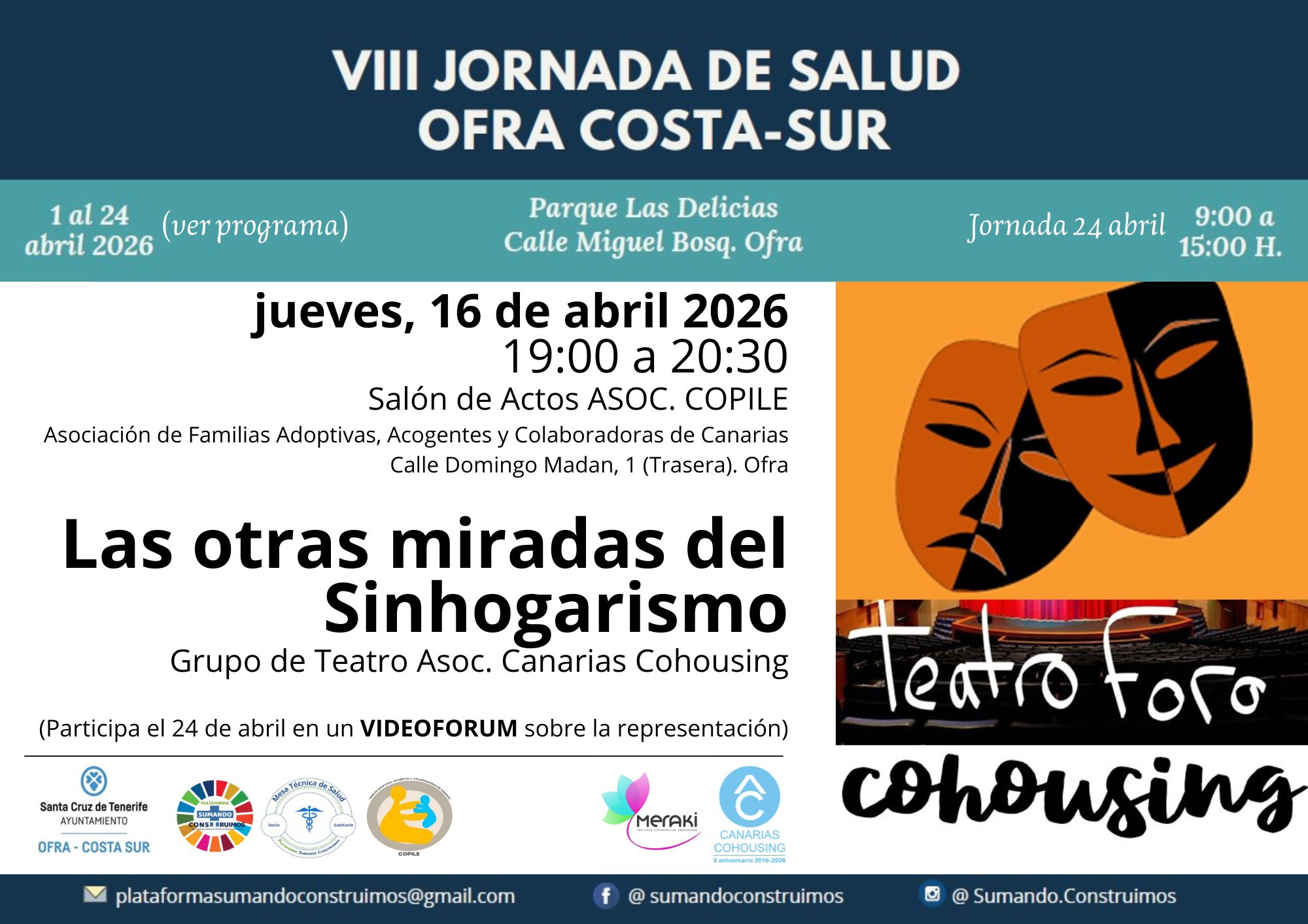 Desde Canarias Cohousing representaremos la obra titulada»LAS OTRAS MIRADAS DEL SINHOGARISMO» en el marco de la VIII FERIA DE SALUD 2026 OFRA COSTA SUR, con el apoyo e invitación de la Asociación Meraki y de la mesa técnica de Salud del Distrito Ofra Costa Sur.
